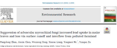 通过在兰坪铅锌矿区连续2年的大田试验研究,发现颗粒态镉(Cd)、铅(Pb)是土壤地表径流Cd、Pb流失的主要形式,而溶解态(Cd)是20 cm和40 cm深处壤中流Cd淋失的主要形式。施用杀真菌剂(苯菌灵)会特异性抑制农田土著丛枝菌根真菌(AMF)在玉米根部的定殖,降低球囊霉素相关土壤蛋白(GRSP)含量,增加玉米地上部对Cd的吸收;并导致地表径流和壤中流Cd浓度增加,地表径流和20 cm深度壤中流溶解态Cd流失分别增加34.7%和68.0%,颗粒Cd流失分别增加46.4%和19.7%。类似的,颗粒态铅(Pb)是土壤地表径流Pb流失的主要形式,溶解态Pb浓度随着土壤深度增加而增加;施用苯菌灵抑制农田土著AMF会增加玉米叶部对Pb的吸收,导致农田壤中流溶解态Pb浓度和流失降低,而颗粒态Pb浓度和流失增加,农田地表径流和壤中流总Pb的流失增加。